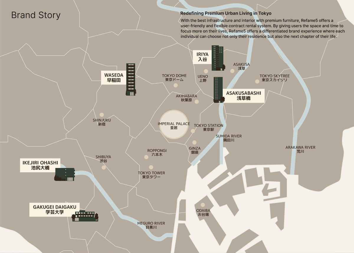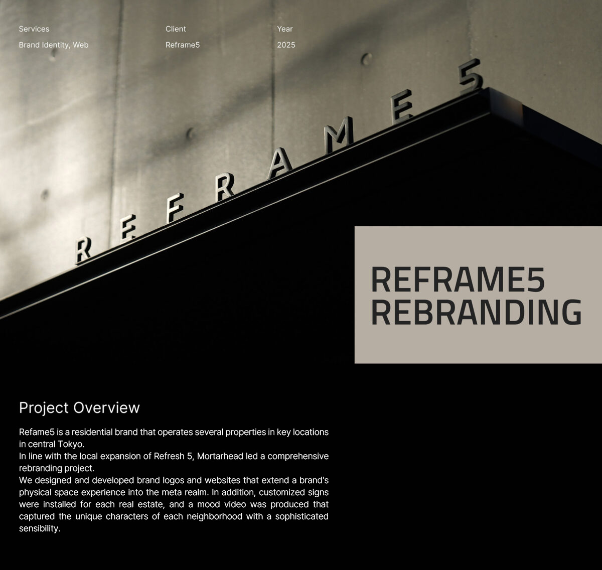 Refame5 is a residential brand that operates several properties in key locations in central Tokyo. In line with the local expansion of Refresh 5, Mortarhead led a comprehensive rebranding project.