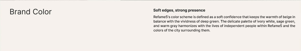 Refame5’s color scheme is defined as a soft confidence that keeps the warmth of beige in balance with the vividness of deep green. The delicate palette of ivory white, sage green, and warm gray harmonizes with the lives of independent people within Refame5 and the colors of the city surrounding them.