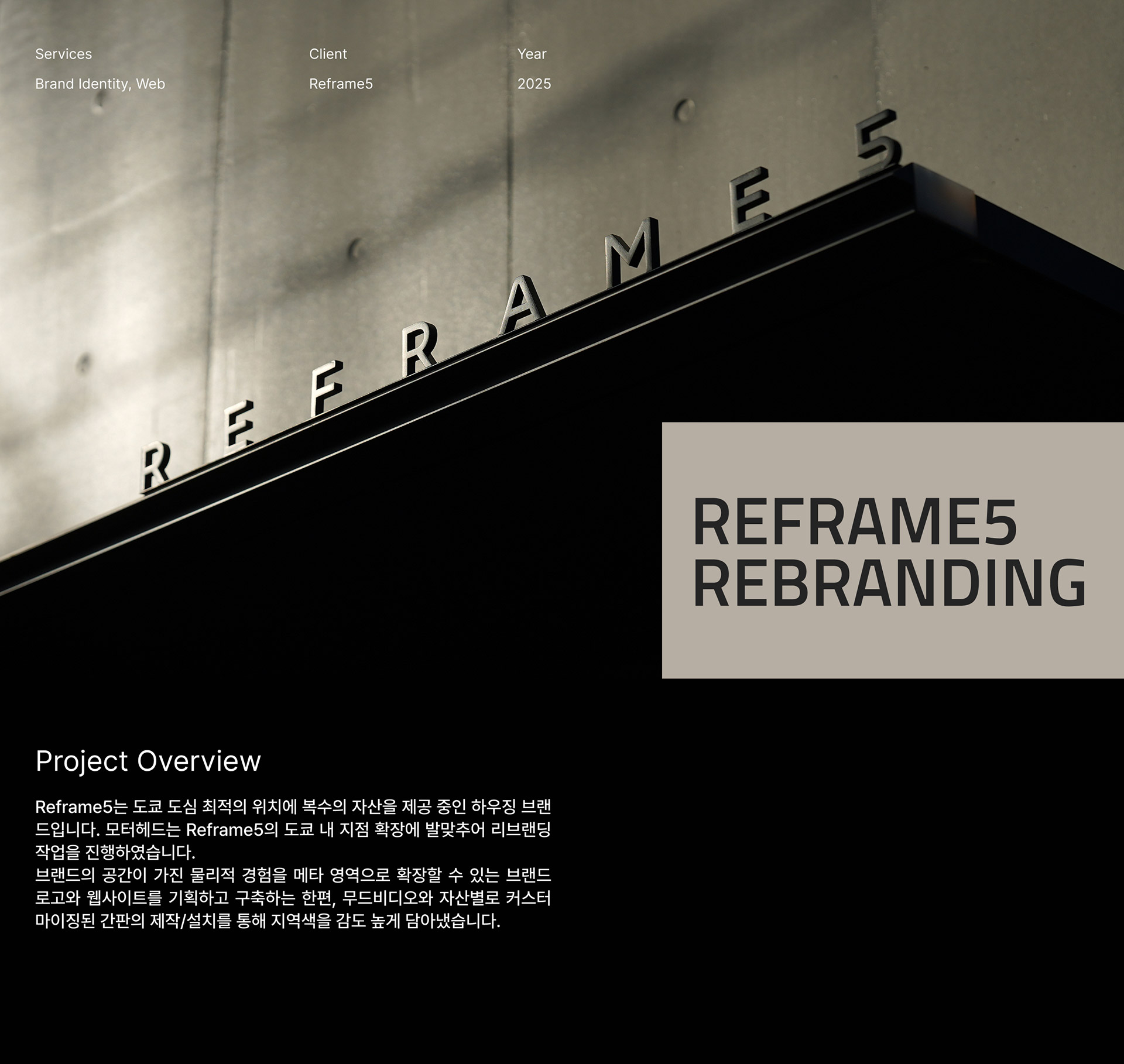 Reframe5는 도쿄 도심 최적의 위치에 복수의 자산을 제공 중인 하우징 브랜드입니다. 모터헤드는 Reframe5의 도쿄 내 지점 확장에 발맞추어 리브랜딩 작업을 진행하였습니다.